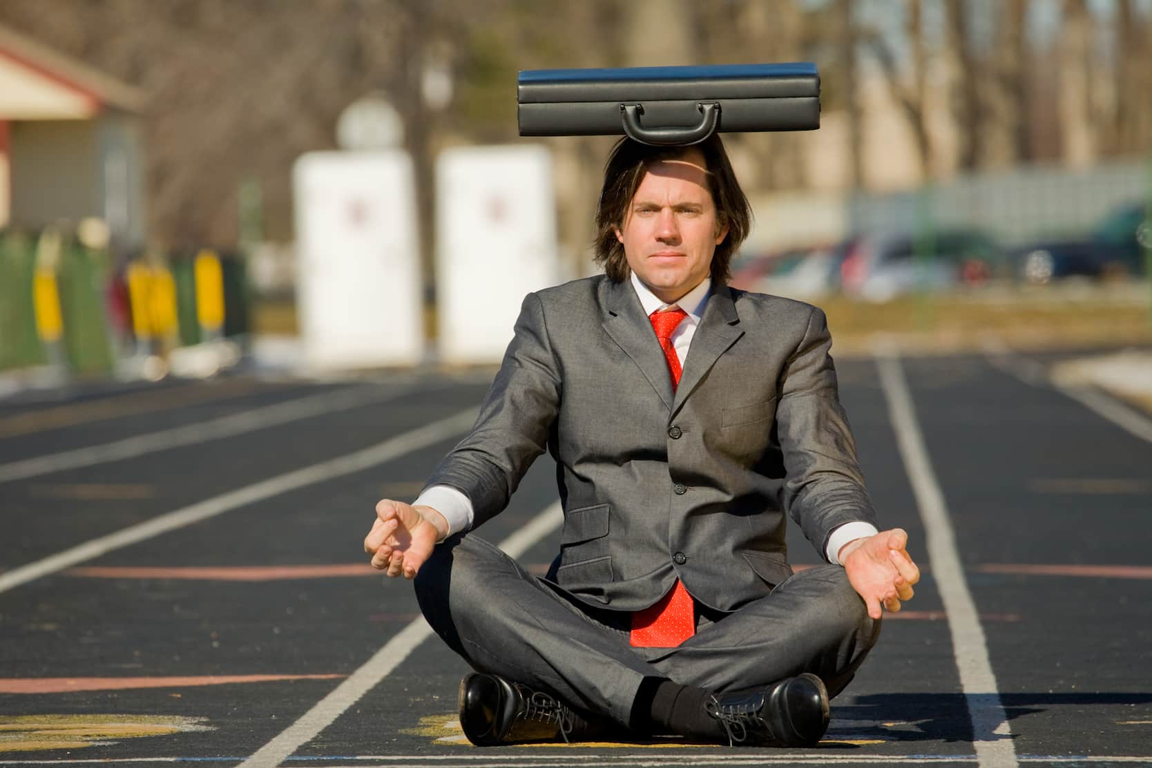 Business man balances briefcase on head